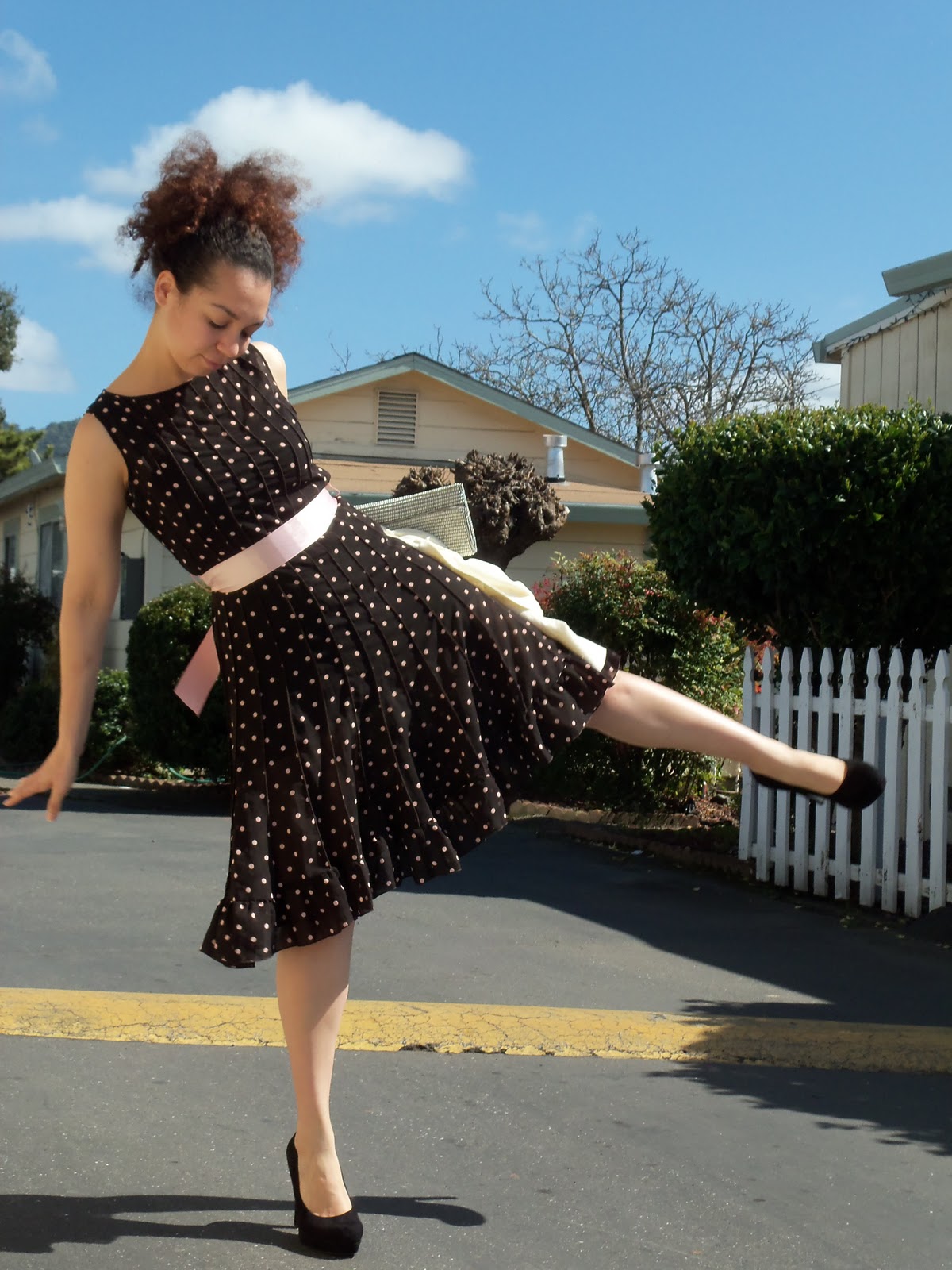 It seems to me that there really is nothing more fun than slightly inappropriate ensemble of polka dots.With a high neckline, and an Easter Sunday-like sash, tossed together with a certain je ne sais quoi of Pretty Woman (remember the dress worn for the derby scene?), this dress was begging to have it's slip hiked up.